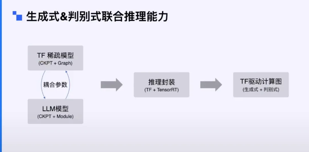 在生成式和判别式联合推理能力方面,我们以基于 TensorFlow 的 CTR(点击通过率)和 CVR(转化率)排序模型(即典型的稀疏模型)为例,同时结合像 LLaMA 等典型的大语言模型。我们的目标是将这两者耦合在一起,这种耦合并非简单的分步推理(即上一步推理完成后再进行下一步),而是通过直接共享 hidden state(隐藏状态)来驱动整个图的共享,从而实现整个推理过程的封装。