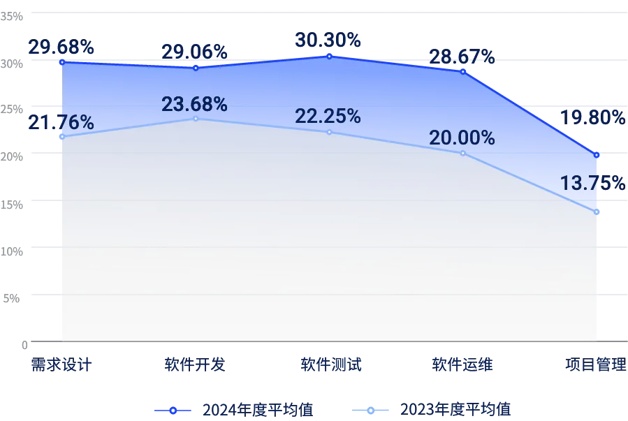 2024 年度受访企业在需求分析和运维领域应用了 AI 技术的占比大幅增高,提升幅度均在 10% 左右,开发、测试在 2023 年已经有诸多企业落地应用了 AI 技术,但 2024 年度也有小幅度提升。总体数据显示企业在软件工程领域应用 AI 技术的比例显著升高,软件工程的智能化转型势在必行。