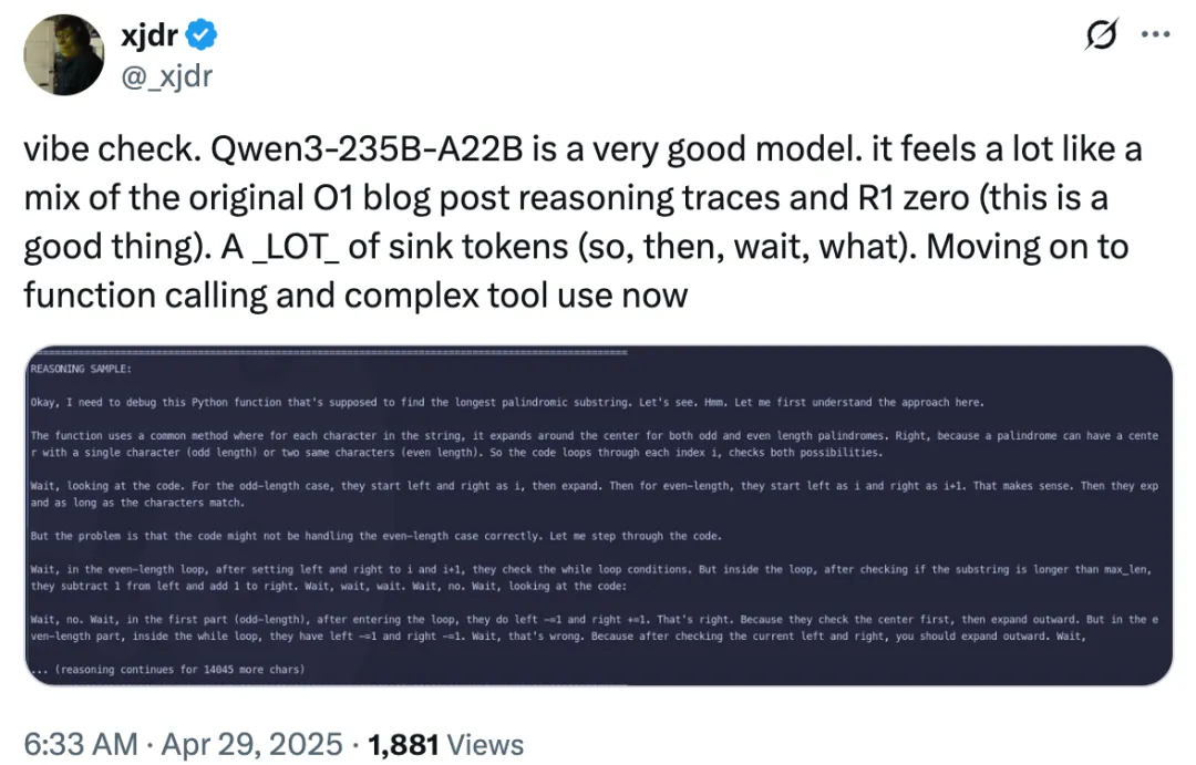 网友 xjdr 表示,Qwen3-235B-A22B 是一个非常优秀的模型。“它的感觉很像是原始 o1 博客文章中的推理轨迹和 R1 zero 的结合(这是件好事)。但模型出现了大量的“sink tokens”,比如 so、then、wait、what 等。”