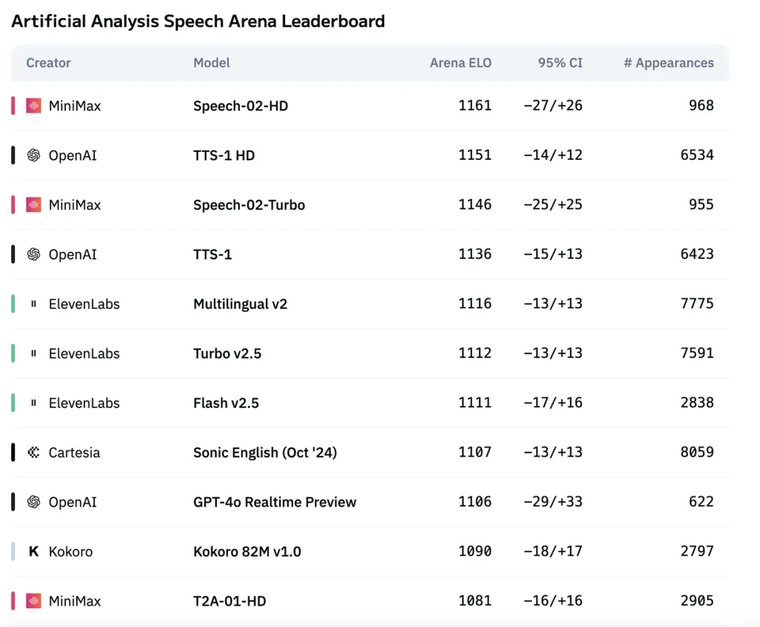 在 Artificial Analysis Speech Arena Leaderboard 上,Speech-02 模型的 ELO 评分达 1161,力压 OpenAI、ElevenLabs 旗下的一众模型。Arena 榜单的 ELO 评分,是根据用户在听取并比较不同模型的语音样本时,做出的主观偏好判断得出的。这也意味着,与其他行业领先的语音模型相比,用户明显更偏好 Speech-02。