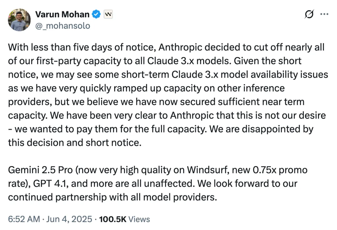 当地时间 6 月 4 日,Windsurf CEO Varun Mohan 发帖称,在提前不到五天的通知时间里,Anthropic 切断了其几乎所有 Claude 3.x 模型的直接访问权限(first-party capacity),包括 Claude 3.5 Sonnet、3.7 Sonnet 和 3.7 Sonnet Thinking。