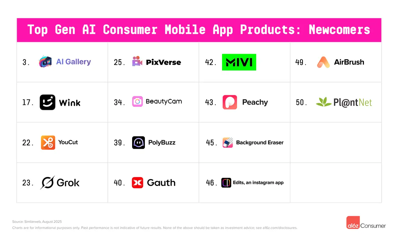 除了首批名单外,还有另外五家公司将入选——这反映了它们近期的发展势头。这些公司同样代表了各种AI消费应用,包括:Claude和DeepAI(通用辅助)、JanitorAI(陪伴)、Pixelcut(图像编辑)和Suno(音乐生成)。
