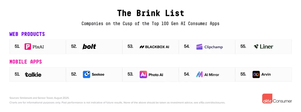 我们还第二次发布了“边缘名单”:接下来的10家公司(5家在网页端,5家在移动端),它们只差一点就达到入选标准。从上一版的网页“边缘名单”中,有一家公司跻身前100名——Lovable,在排名中跃升至令人瞩目的第22位!这一跃升凸显了AI驱动的应用程序生成的广泛崛起。