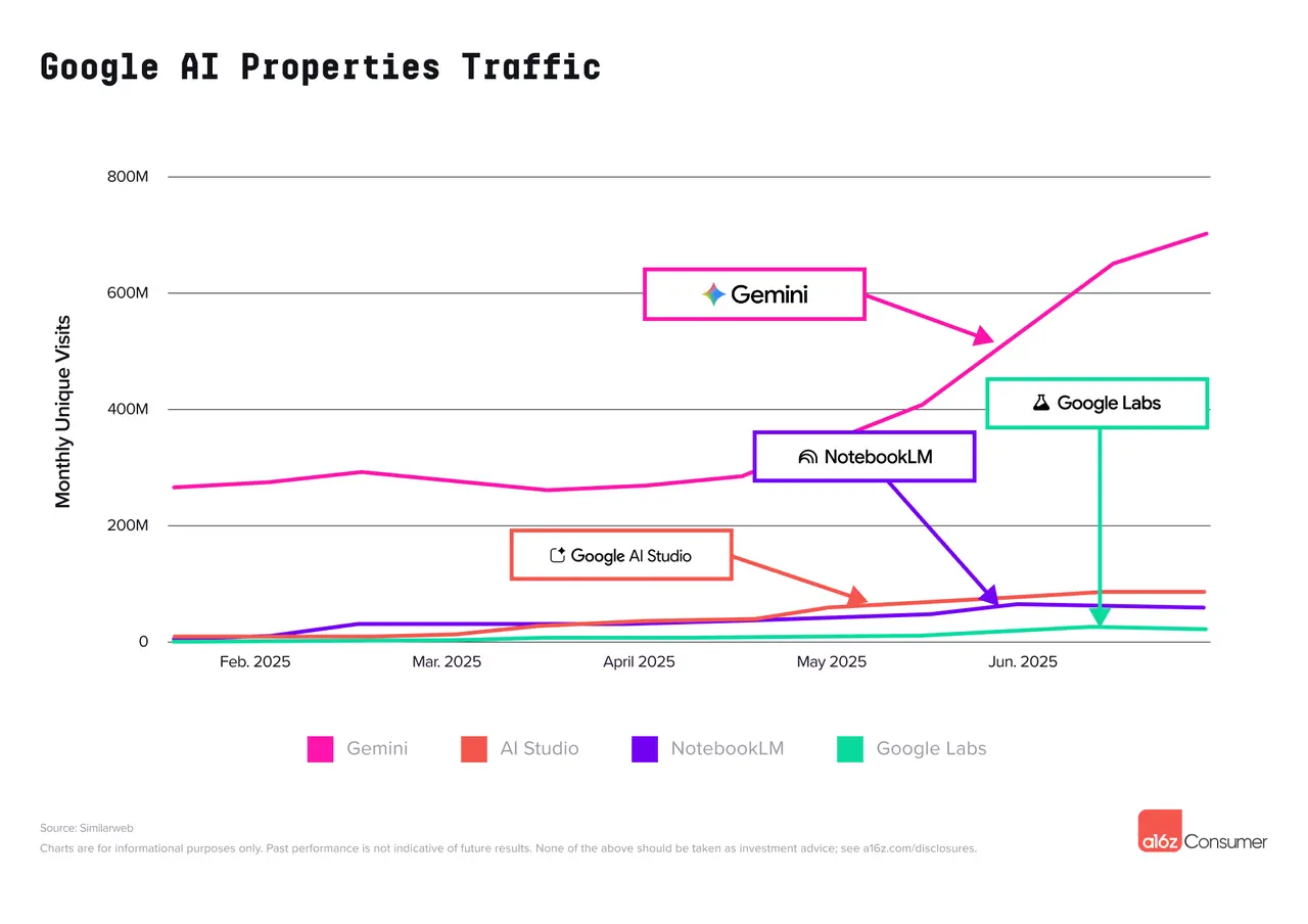 还有哪些谷歌产品上榜了?AI Studio首次跻身前十。这个面向开发者的网站提供了一个沙盒,可使用Gemini模型进行开发,包括多模态模型(例如,通过Gemini Live进行对话和流式传输)。