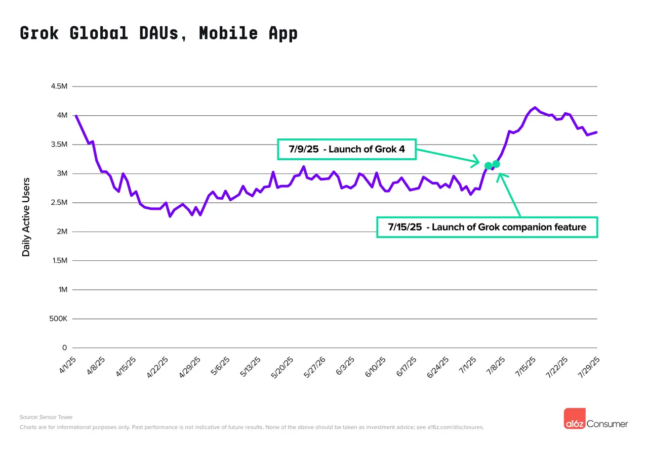 2025年7月,Grok的移动设备使用量出现了显著增长,7月9日新模型Grok 4(具备卓越推理、实时搜索和工具集成功能)发布后,使用量攀升近40%。随后,7月14日推出了AI伴侣虚拟形象。发布时,动漫虚拟形象Ani(包含NSFW选项)尤其受欢迎。