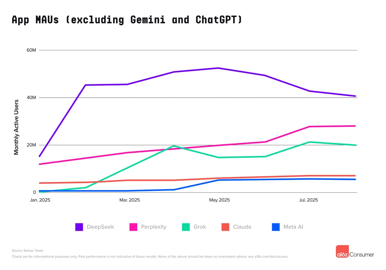 在通用大语言模型助手的竞争中,DeepSeek和Claude在移动端的表现均大幅下滑,其中DeepSeek较峰值下降了22%。Perplexity和Grok则持续保持强劲增长。