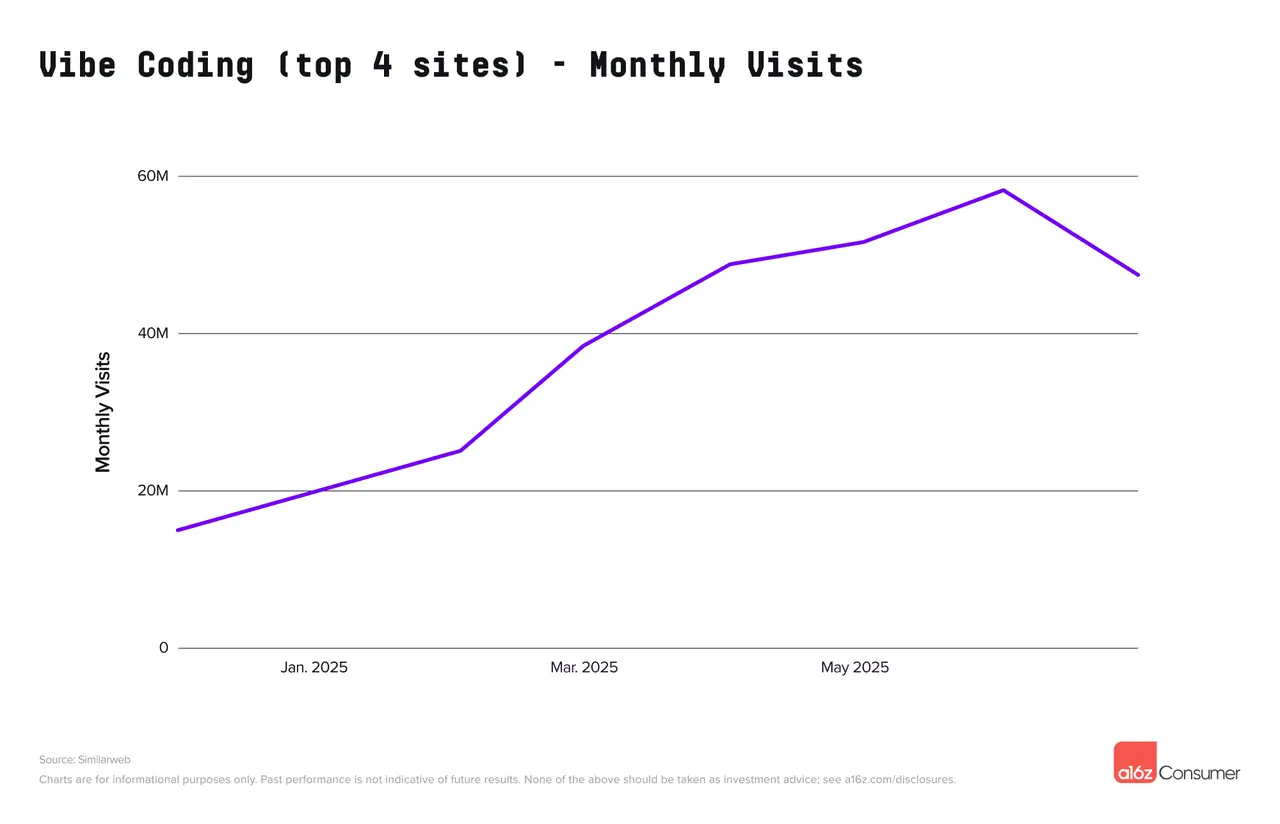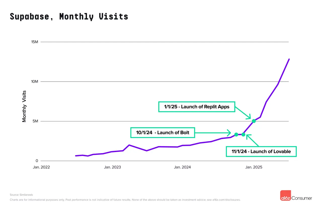 作为“vibe coding栈”一部分的产品也迎来了流量的激增,因为vibe coding者采用这些产品来推动他们的项目上线。这些产品不符合入选标准(因为它们本身并非原生AI公司)——典型例子是数据库提供商Supabase。Supabase的流量与核心vibe coding平台的崛起几乎同步,与前几年相比,在过去九个月中显著加速。