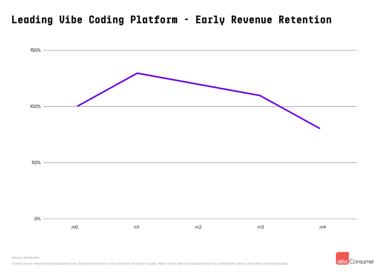 虽然vibe coding的使用可能看似短暂,但早期数据显示,这些用户会持续使用——或者至少有足够多的用户会这样做,并随着时间的推移增加使用量。信用卡面板提供商Consumer Edge的数据显示,美国一家顶级vibe coding平台的用户群体在注册后的几个月内,收入留存率高达100%以上。这意味着,即使包括流失的用户,用户群体的每月总支出仍在增长。