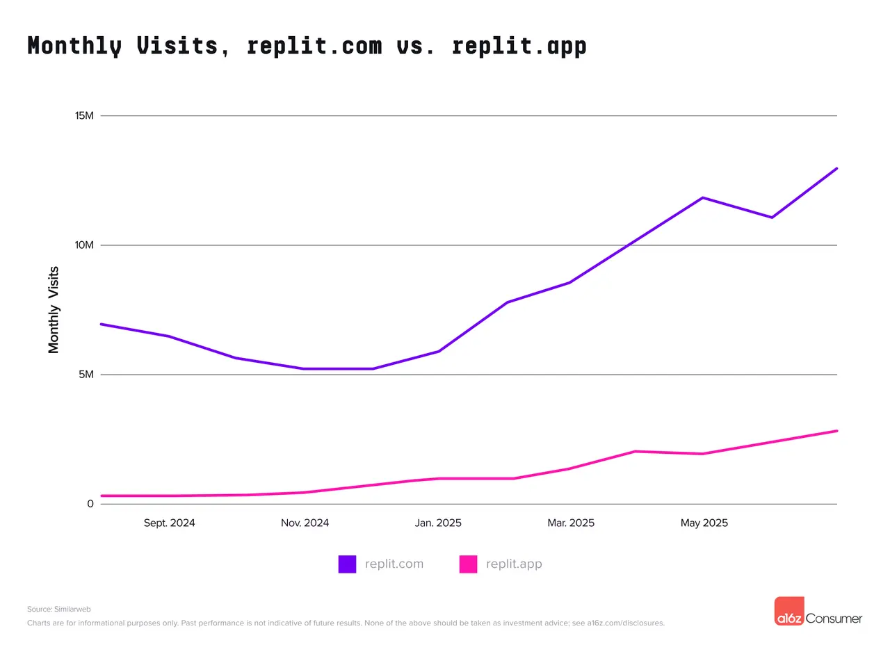 这些平台也在推动其他AI产品的使用。通过Replit和Lovable(无自定义域名)构建和发布的网站,其流量分别计入replit.app和lovable.app。两者本身都有相当大的流量(lovable.app的流量本可在榜单中排名前50),但流量少于其构建者界面网站。