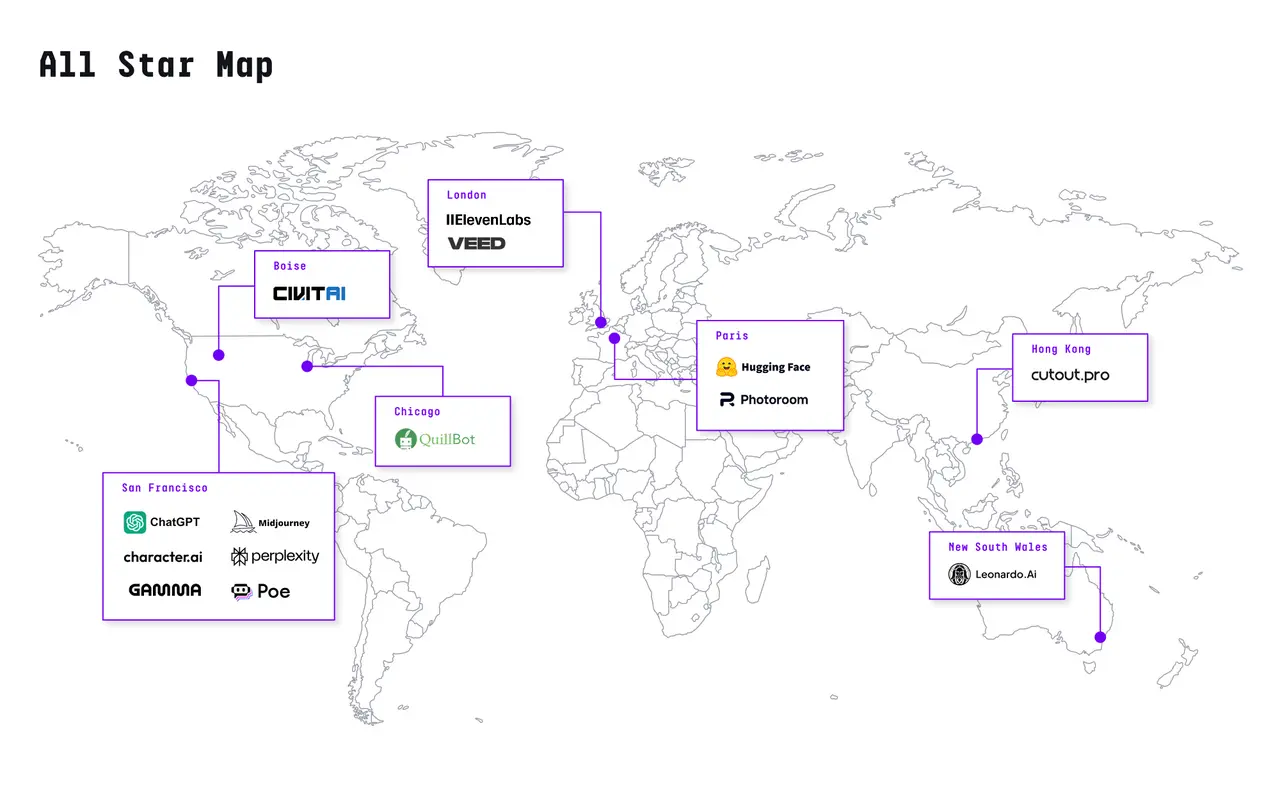 这些公司代表了AI在消费者行为中的真实横截面——通用辅助(ChatGPT、Perplexity、Poe);陪伴(Character AI);图像生成(Midjourney、Leonardo);图像和视频编辑(Veed、Cutout);语音生成(Eleven Labs);生产力工具(Photoroom、Gamma、Quillbot);以及模型托管(Civitai、HuggingFace)。