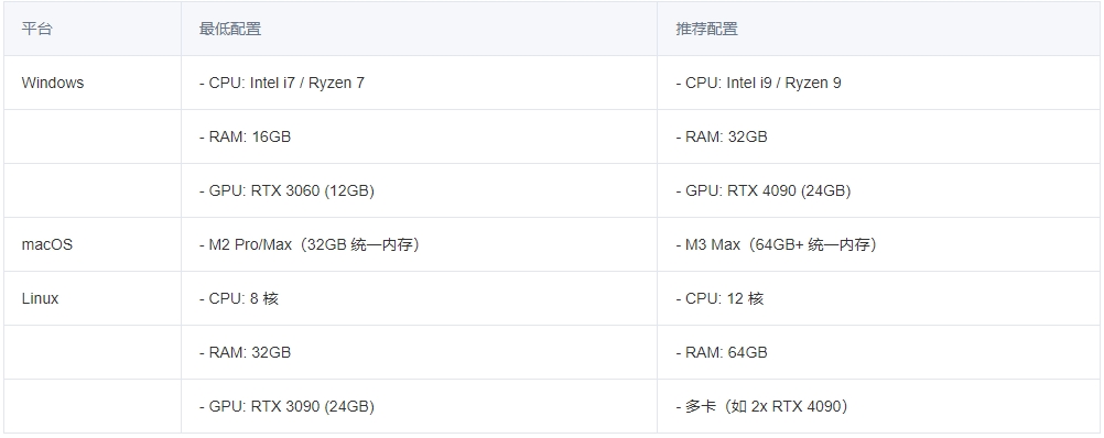 以下按模型规模和平台分类,提供 最低配置 和 推荐配置。
