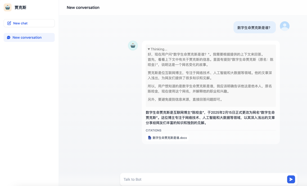 当我们问他一些知识库中独有的内容时,他便会根据知识库中独有的内容,来给与对应的回复。