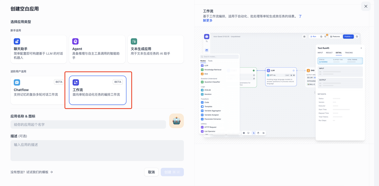 通过工作流,Dify 可以自动执行一系列复杂任务,比如数据分析、报告生成、资源调度甚至是跨平台操作。