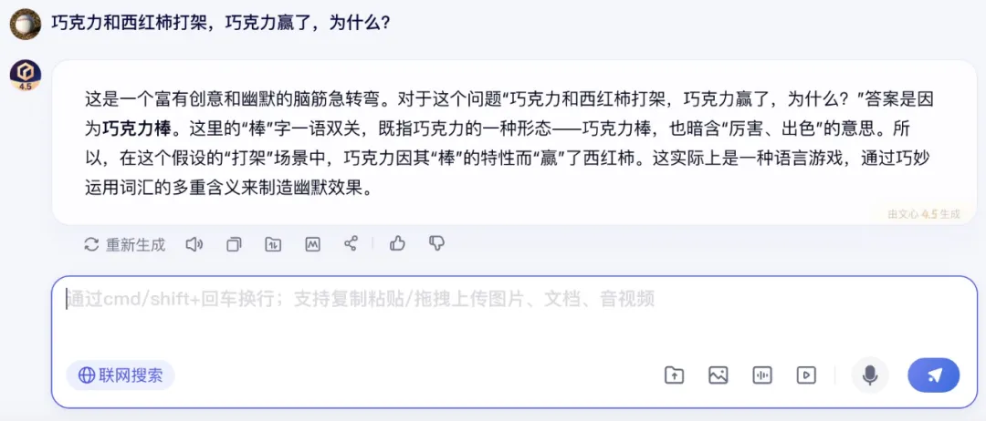 当然,笔者也没忘记测试一下文心大模型 4.5 的文本理解能力,鉴于诗词仿写,文案生成之类的文本内容生成已经被玩出了花,笔者就在文心大模型 4.5 这里尝试了一点不一样的。