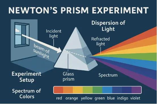 然后,现在在同一场景下,显示难掩兴奋的年轻牛顿坐在桌旁,手持棱镜演示实验结果,注意画面中不要出现笔记本。