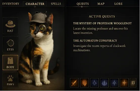 创建界面,当玩家打开菜单时显示小猫的角色资料和装备,另一页显示当前任务(任务内容应与图像中呈现的世界观保持关联)。